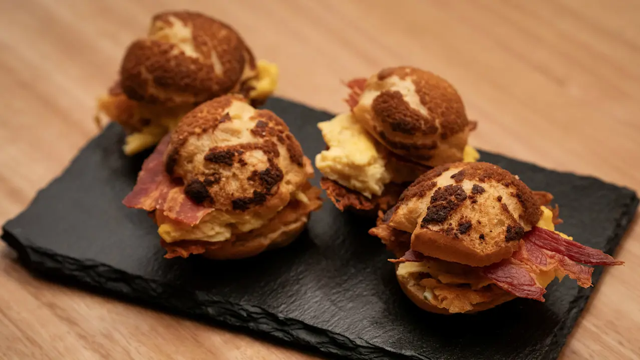 To assemble, cut each choux bun in half, add a scoop of chive custard to the inside of the top and bottom buns. Then from the bottom up, layer hash brown with egg and finish with bacon. Place the top back on and serve.